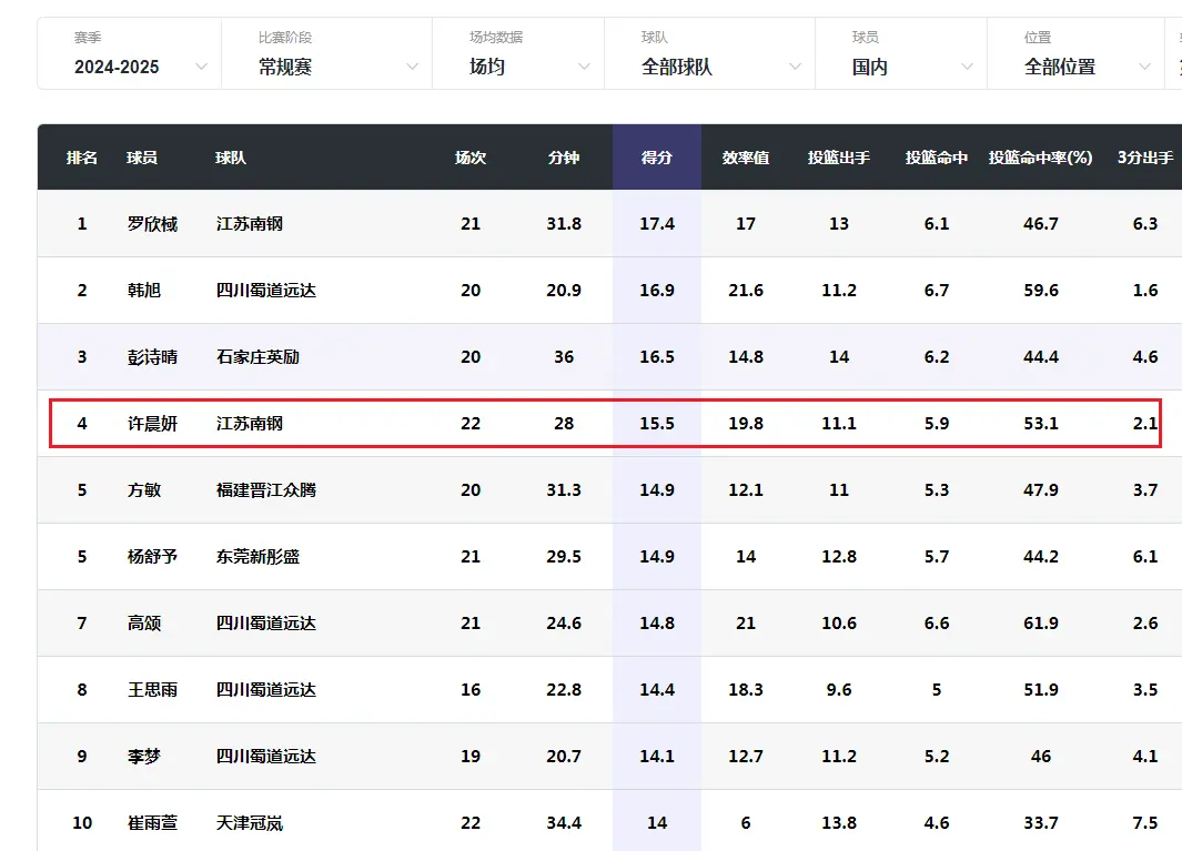 许晨妍的布置和李月汝比较雷同,她不错成为李月汝的最好替身。她在本赛季场均获取15.5分8.4篮板1.8助攻1.0抢断0.7盖帽,投篮掷中率53.1%,三分掷中率26.1%,罚球掷中率81.4%。本赛季WCBA联赛原土球员得分榜上,许晨妍排行第四。罗欣棫17.4分第一,韩旭16.9分第二,彭诗晴16.5分第三,方敏和杨舒予皆是14.9分比肩第五,高颂14.8分第七,王念念雨14.4分第八,李梦14.1分第九,崔雨萱14.0分第十。